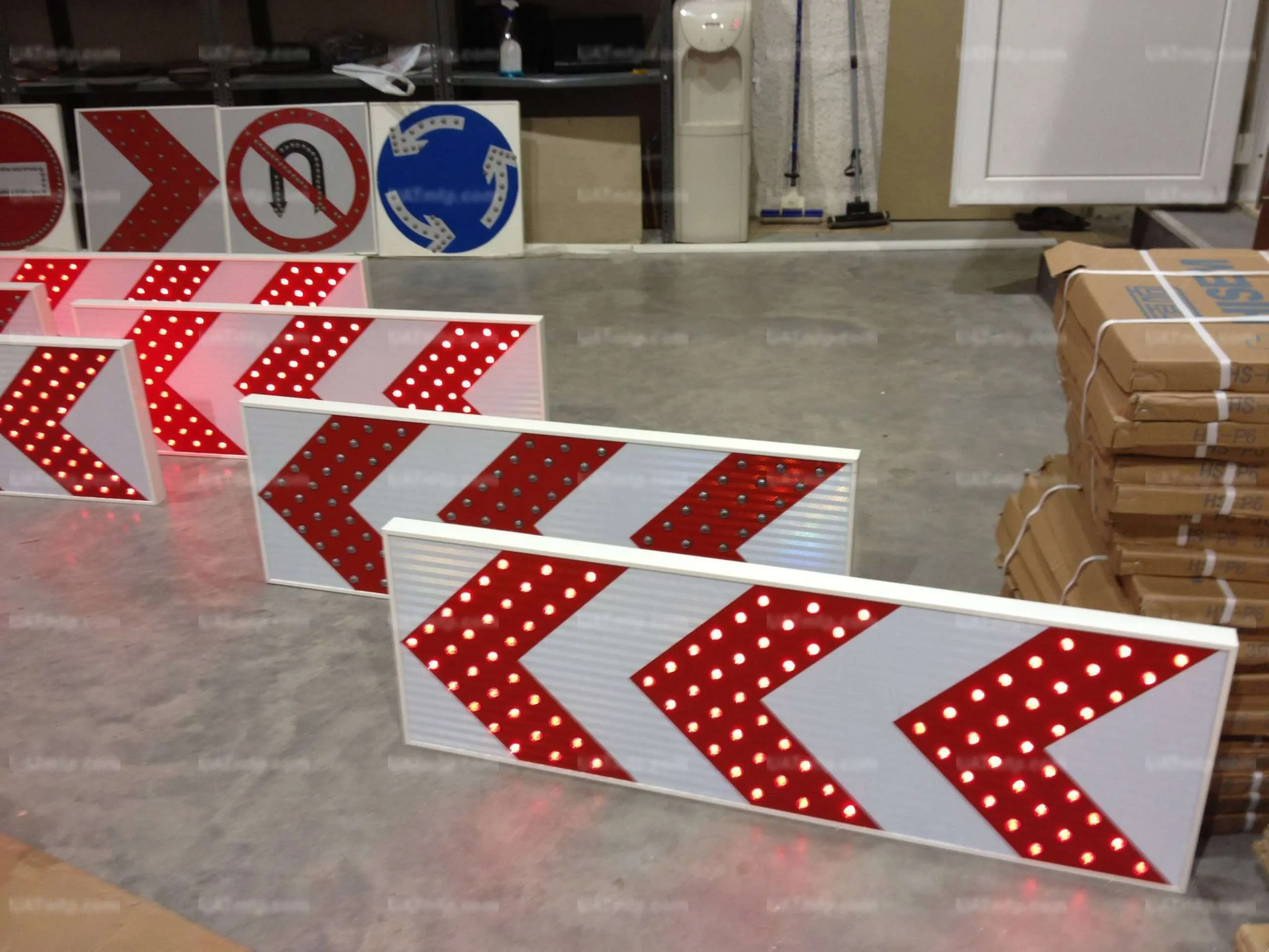 LED Illumination: Solar traffic chevron signs typically feature bright LED lights arranged in a chevron (arrow) pattern. These LEDs light up when it gets dark or when ambient light levels drop below a certain threshold, ensuring the sign remains visible to drivers.